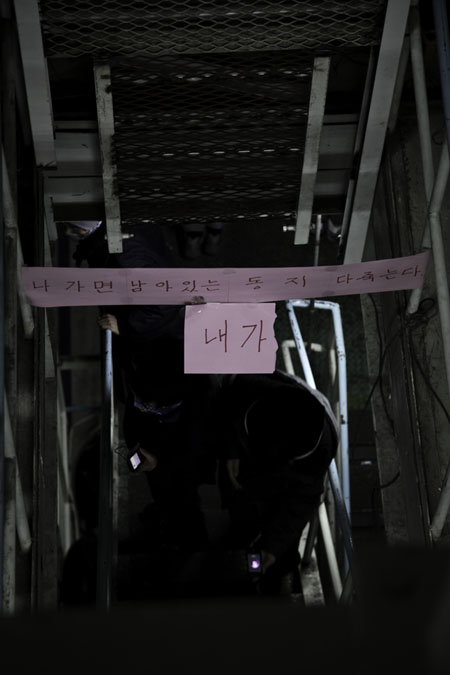 ▲ 정규직으로 가는 계단. 농성장 아래 1층은 정규직들만 자유롭게 다닐 수 있다. 비정규직들은 25일 동안 정규직으로 가는 계단 아래로 내려갈 날을 꿈꾸며 잠들었다. |
