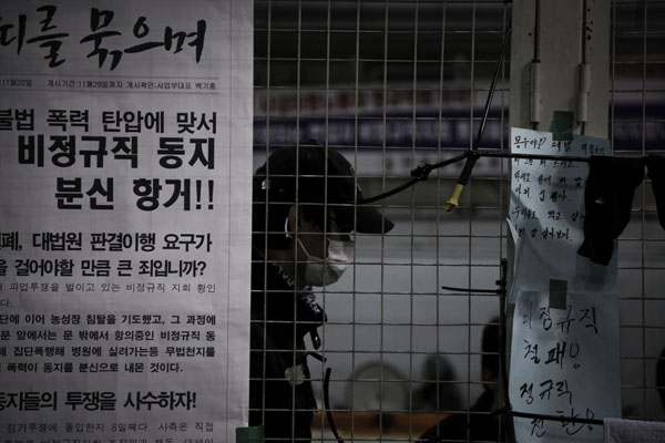 ▲ 농성자 중 유일한 여성이었던 김미진 대의원이 농성장 입구에서 농성장을 나가는 조합원들을 바라보고 있다. |