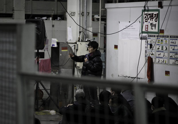 ▲ 농성 13일째 김진숙 지도위원의 교육이 있었다. 이경훈 정규직 노조 지부장은 김진숙 지도위원의 교육이 정규직 노조 허락도 없이 이뤄졌다고 김 지도위원을 쫓아내다시피 밖으로 보냈다. 교육이 끝난 김진숙 지도위원은 조합원들과 변변한 이야기도 나누지 못했다. |