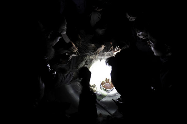 ▲ 2010.12.02. 오후 6시 27분. 회사 쪽의 단전으로 인해 어둠 속에서 후레쉬 불빛을 비추며 간만에 들어온 쌀밥을 먹었다. |