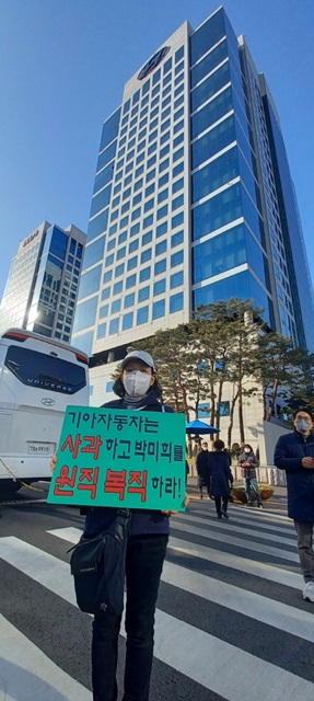 ▲ 서울 서초구 양재동 현대기아차 본사 앞에서 원직복직·사과 요구 피켓을 들고 있는 박미희 씨 [출처: 연정] |