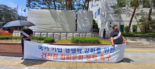 ▲ 6월 7일 오전, 서울 서초구 양재동 현대기아차 본사 앞. 회사명이 쓰인 비석 앞에 현대기아차가 고용한 ‘알박기집회’ 용역들이 현수막을 들고 서있다. [출처: 연정] |