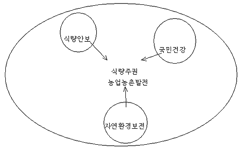 지금까지 식량문제, 국내 농업·농촌발전 요구는 '식량안보' 논의 이었다. 그러나 식량안보는 (생산량과 비축량을 함께 포괄하는) 공급량 차원의 접근으로 이 논리만으로 국내 농업·농촌발전의 국민적 이해를 구하는 데는 턱없이 부족했다. 식량자급률 25.3%, 쌀을 제외하면 3%라는 참담한 현실 속에서도 우리는 1일 2000kcal이상의 포식 시대에 살고 있다. 모순처럼 보이지만 이를 가능케 하는 것은 우리가 세계화 시스템 하 수입개방을 전제로 식량안보와 국내 농업을 논해 왔기 때문이다. 미국 핵우산 아래 우리의 국가안보를 맡겨온 것과 동일한 이해이다. 식량안보상 뭐가 문제인가 하는 국민들의 반응은 어쩜 당연한 일이다.