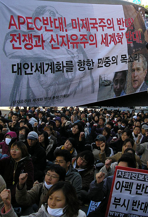18일 오전 10시 부산대학교 앞에서 '신자유주의 세계화 반대 투쟁기획단'이 주최하는 '아펙반대, 미 제국주의반대, 전쟁과 신자유주의 세계화 반대, 대안세계화를 향한 민중의 목소리' 집회가 열렸다.