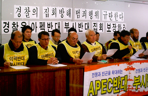전국적으로 농민들의 부산집결을 막는 경찰당국의 행태에 대한 아펙반대부시반대국민행동의 긴급 규탄 기자회견이 10시 50분 경 민주노총 부산본부에서 개최했다.