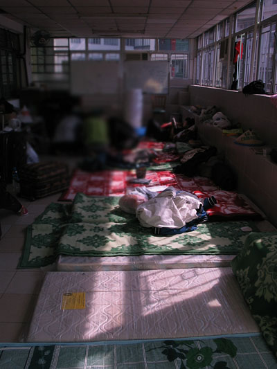 24일 방문한 교회. 아직 피곤이 가시지 않은 모습, 아직 풀리지 않은 짐들도 수개다. 심지어 홍콩시민들이 건네준 선물 꾸러미 까지. 아직까지는 정신 없는 숙소의 모습 그대로다. 그래도 벌써 부엌담당 식사조가 구성되어 있고, 아침 체조와 몸관리를 어떻게 할 것인가에 대한 얘기들이 오고가고 있다.