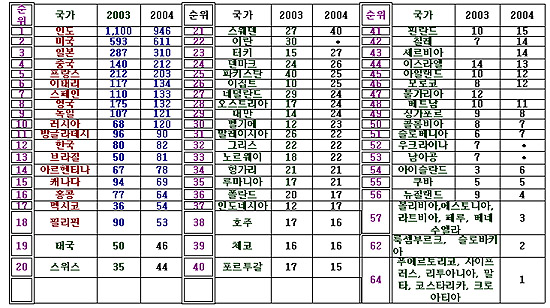 ▲ 나라별 극장 영화 제작 수 (2003, 2004년 기준) (단위: 개) / 자료 출처: 스크린 다이제스트, 6월 2005 |