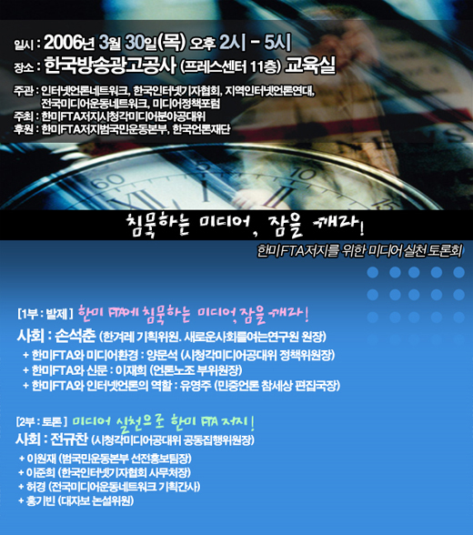 지금이라도 늦지 않았다. 정부와 자본의 합의 아래 추진되는 한미FTA의 실상을 우리 사회구성원들에게 조목조목 알려냄으로서 미디어로서의 최소한의 양심을 지키고, 나아가 한미FTA를 저지하는 미디어 실천에 적극적으로 나설 때이다.