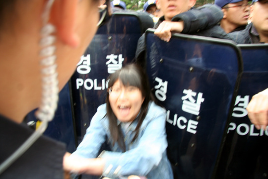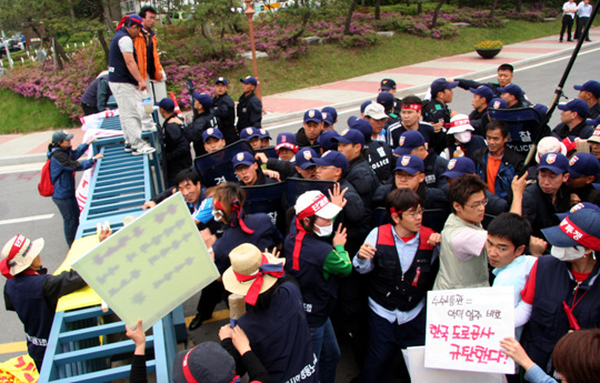 ▲ 집회를 마친 노동자들은 한국도로공사 본관으로 가기 위해 맨 몸으로 경찰의 방패 앞에 몸을 던진다 |