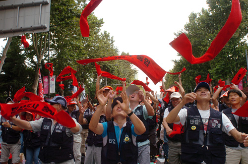 이준상 발전노조 위원장은 “시대의 악법 직권중재에 기대 교섭을 회피하는 사측에 맞서, 우리의 힘을 무시하고 있는 산업자원부에 맞서 기필코 승리할 것”이라며 “우리의 투쟁은 촛불을 켜고 밤을 지세다 죽어간 아이들을 위한 것이며, 전력의 공공성을 확장하기 위한 싸움이다”라고 목소리 높였다. 위원장의 발언에 조합원들은 “파업 투쟁 승리”로 대답했다.