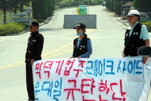 용역경비들의 무자비한 폭력, 보는 이들이 펑펑 목을 놓아 울었던 삭발식, 경찰의 정문 봉쇄를 뚫고 골프장에 진입 성공, 찢겨진 천막농성장, 산 투척으로 실명위기에 놓인 연대투쟁 온 오리온전기 노동자, 그리고 위원장 구속 이후 직무대행을 맡아 파업을 이끌어 온 장보금 사무장의 눈.