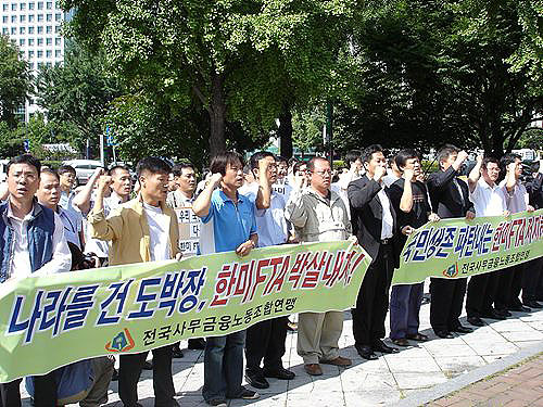 연대발언을 한 지금종 범국본 공동 집행위원장은 “정권이 노동자를 죽여도 잠잠한 민주주의 위기, 신자유주의 가속화로 민생의 삶이 나락으로 떨어지는 민생의 위기”로 현 시기를 규정한 뒤, “절대적 위기 국면에서 한미FTA 저지 싸움을 통해 사회적 전환점과 대안적 모습을 만들어내자”며 희망을 갖자고 독려했다.