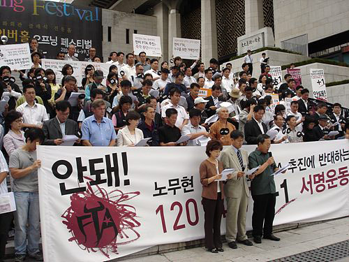 이날 출범한 ‘한미FTA반대 범국민서명운동본부’(서명운동본부)는 김세균, 오종렬, 유영일, 이명남, 정광훈 등 제 노동사회단체 대표들을 공동본부장으로 선임하고 오늘 부터 전국적인 활동에 돌입한다.