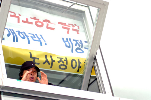 9명의 항의농성단이 난간으로 나가자 경찰이 안에서 소화기로 유리창을 깼고, 피할 곳이 없는 상황에서 유리 파편을 정면에 맞은 노동자 3명이 부상을 입은 것으로 전해진다. 농성단은 난간에서 계속 "한국노총 해체하라", "이용득은 퇴진하라"는 등의 구호를 외치고 있으며, 이들을 지지하기 위해 한국노총 건물 앞에 모여있는 30여 명의 노동자들은 함께 구호를 외치며 조마조마한 심정으로 이들을 올려다보고 있다.