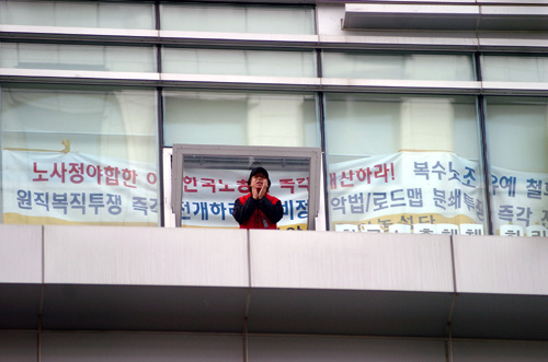 낮 12시 30분을 기해 한국노총 7층 부위원장실을 점거한 '노사정 야합 분쇄 항의농성단'이 부위원장실 밖 창문 난간에서 농성을 계속하고 있다.