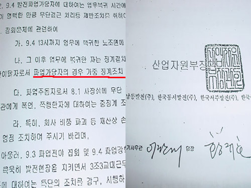 ▲ 산자부는 지난 4일에 있었던 발전노조 파업 참가 조합원을 가중처벌하라는 공문을 내려보냈다. [출처: 공공연맹] |