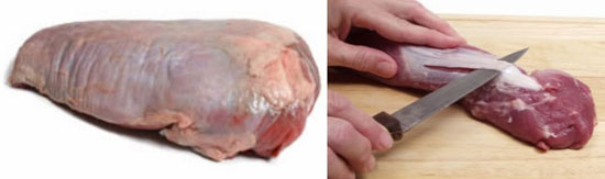 ▲ 근막(silver skin). 일부 근막은 연골화되어 요리를 할 때, 오른쪽 사진처럼 칼로 손질을 해야한다. |