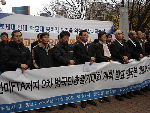 범국본은 "경찰력을 동원해 전원을 잡아두는 한이 있어도 민생을 파탄 시킬 한미FTA 협상의 본질을 달라지지 않는다"고 강조하며 "정부가 군사독재식 원청 봉쇄와 무더기 구속, 탄압책을 강행한다 할지라도 우리는 끝까지 정당한 요구와 주장을 꺽지 않을 것"이라고 밝혔다.