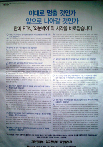 ▲ 지난 7월 7일 한겨레신문 전면에 실린 한미FTA 홍보 광고/참세상 자료사진 |