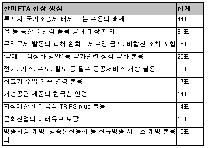 ▲ <표1> 한미FTA 협상 중요한 쟁점(5개씩 선택하여 선정한 Top 10) |