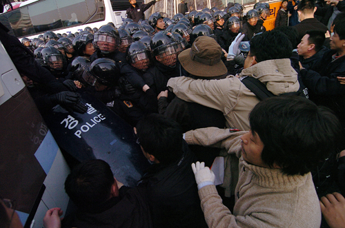 ▲ 전경차로 막아놓은 이중 삼중의 바리케이트를 뚫고 나가려는 집회 참가자와 막아서는 전경들이 서로 밀고당기는 실랑이가 있었다. |