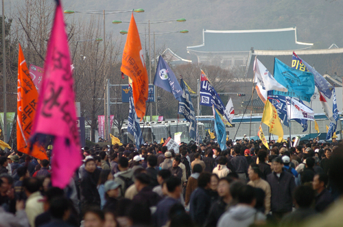 ▲ 경찰이 폴리스라인을 치고 청와대를 향해 행진하는 참가자들을 막아서고 있다. |