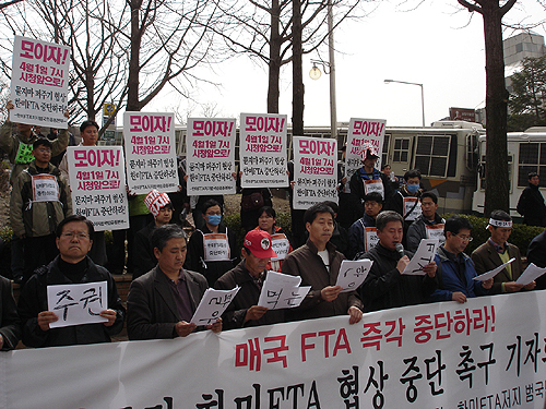 한미FTA저지 범국민운동본부 소속 금융공대위(금융공대위)는 1일 하얏트 호텔 앞에서 기자회견을 갖고 “세이프 가드 조차 지키지 못할 협상을 왜하는가”라며 협상 중단을 촉구했다.