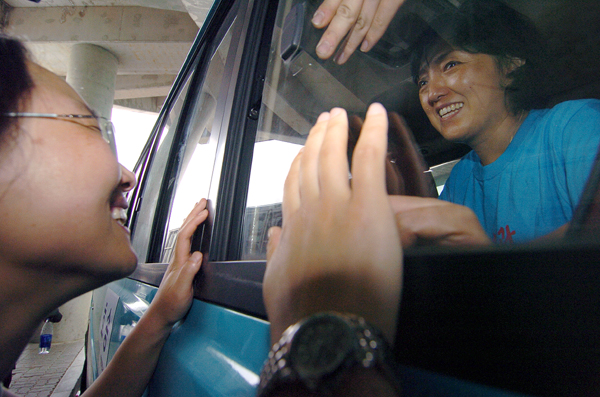 ▲ 김경미 월드컵분회장이 연행되면서 인사를 나누고 있다./이정원 기자 |