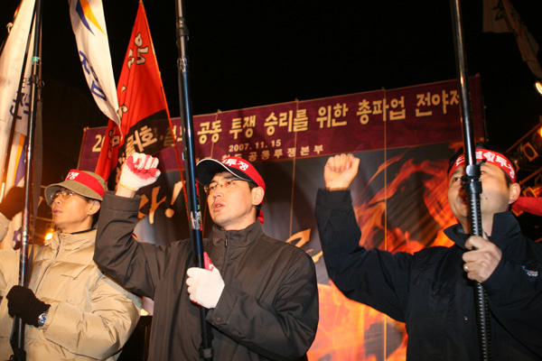 용산 철도차량기지에서 밤 10시부터 시작된 서울지역 전야제에는 화물연대 조합원들이 오른편, 철도노조 조합원들이 왼편에 자리를 잡았다. 화물연대가 이번에 철도노조와 공동 투쟁에 들어가면서 철도노조 조끼와 똑같은 색깔의 검은색 조끼를 제작해 맞춰 입은 모습이 눈에 띈다.