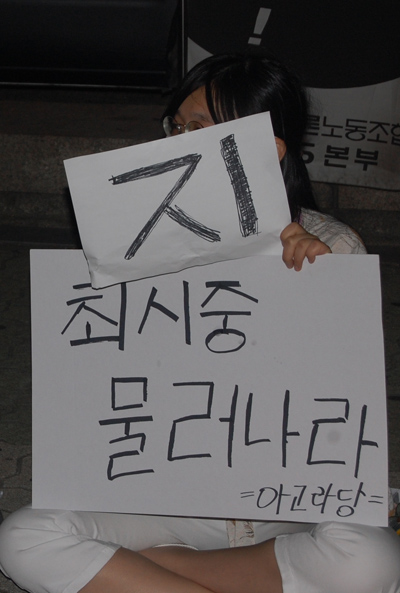 '최시중은 물러가라'는 피켓을 들고 있던 20대 초반의 한 여성 직장인은 최시중 방통위원장이 왜 사퇴해야 하냐고 묻자 "이명박 대통령 측근이니까요"라고 짤라 말했다.