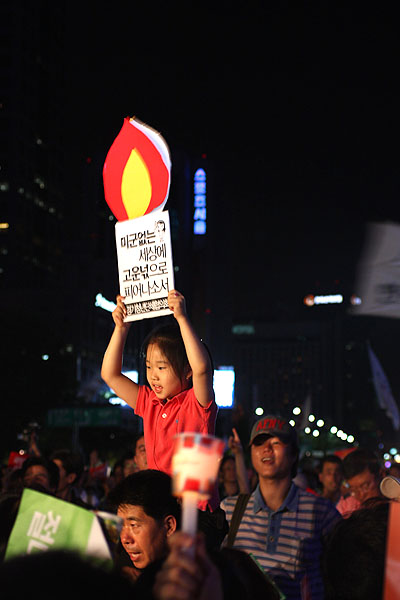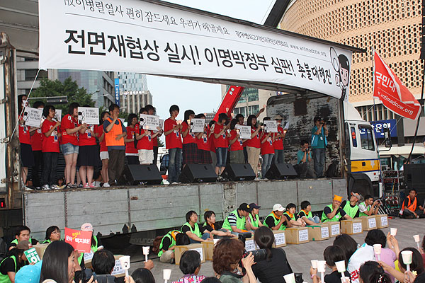 경기도 광주에서 왔다고 밝힌 고등학교 3학년의 여고생은 "우리의 모습은 87년 민주화 운동과 다를 지 몰라도, 물대포를 쏘고 군홧발로 짓밟는 경찰의 모습은 전두환 정권과 달라진 것이 없다"면서 "컨테이너로 우리를 막을 것이 아니라 소통을 생각하라"고 이명박 정부를 비판했다. 이 학생은 또 "학교에서 대입 논술을 준비하며 조중동 논설을 읽는 우리가 뭘 배우겠냐"며 "청소년의 꿈이 광우병 때문에 꺼지지 않도록 계속 촛불을 들어 달라"고 호소했다.