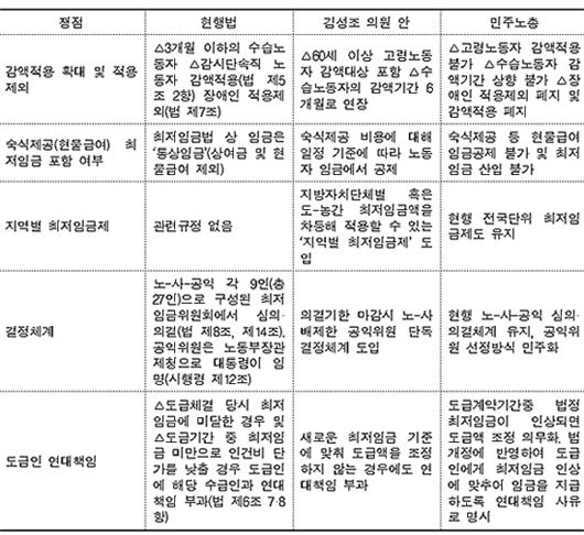 이 개정안은 △지역별 차등 최저임금제 도입 △수습노동 기간을 3개월에서 6개월로 연장 △60세 이상 고령노동자에게 최저임금 감액적용 △사용자가 제공해야 하는 숙박 및 식사비를 최저임금에서 공제할 수 있도록 하고 있다.