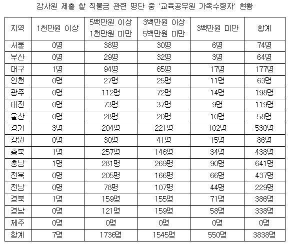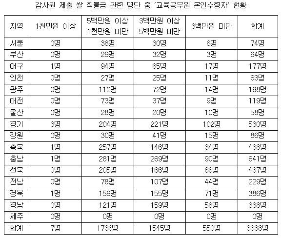 이 가운데 본인이 직접 타 간 교육공무원은 3838명이고 가족을 통해 수령한 공무원은 9820명으로 나타났다.