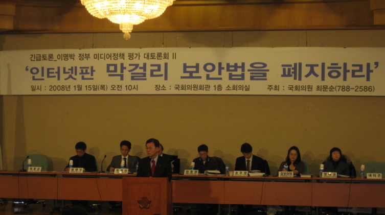 이날 발제를 맡은 전응휘 녹색소비자연대 상임이사는 이번 사건이 "세계 최악의, 소비자/이용자 적대적인 인터넷 이용자 환경 속에서 우리나라 네티즌이 언제든지 겪을 수 있는 사건의 하나일 뿐"이라고 지적했다. '권리침해를 받았다고 주장하는 당사자의 요구에 의해, 포털과 같은 정보통신서비스제공자에 의해, 방송통심심의위원회에 의해서, 그리고 직접 경찰과 검찰에 의해서' 등 전방위적 차원에서 이용자들의 표현행위는 제한되고 있다는 것이다. 전응휘 이사는 이러한 최악의 법제도적 환경이 이 토론회를 주최한 최문순 의원이 속해있는, '민주당'이 집권여당이었던 시절에 마련된 것이라고 일침을 놓았다. 정부와 한나라당의 '언론장악 7대 악법'에 반대하고 있는 민주당이 과거 자신들이 만들었던 '악법'들에 대해 먼저 반성하지 않는다면, 어떻게 민주당의 주장을 신뢰할 수 있겠는가?
