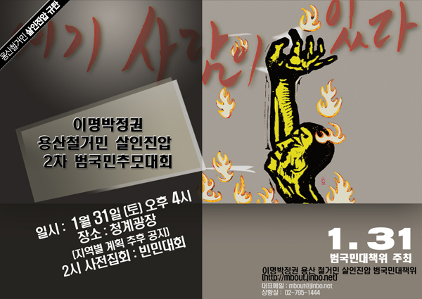 대표자회의에서는 주장과 요구로 △이명박 정권 퇴진 △공정한 수사와 진상규명, 원세훈.김석기 및 책임자 처벌 △뉴타운, 재개발 정책 근본적 대책 마련 △사망자, 부상자, 연행자 및 철거민 대책 마련 등 네 가지로 정리했다.