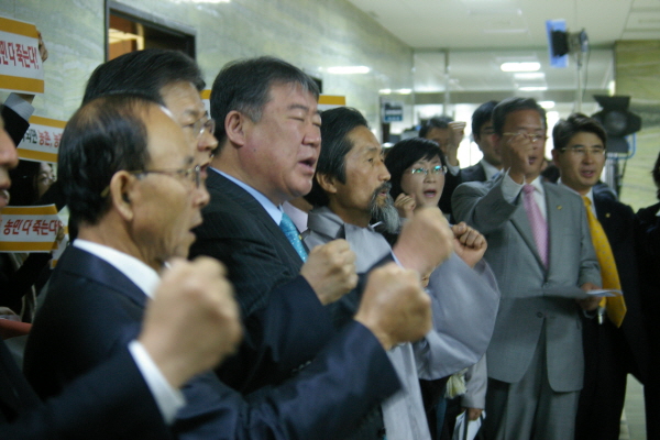 앞서 이날 오전 9시30분 외교통상통일위원회 회의장 앞에서 기자회견을 연 비상시국회의 의원들은 “서둘러 처리할 이유가 없다”며 “선비준은 미국의 재협상 요구가 있을 때 우리정부의 가장 강력한 협상 카드인 국회비준권을 먼저 버리는 일”이라고 밝히고 비준안 처리 중단을 촉구했다.