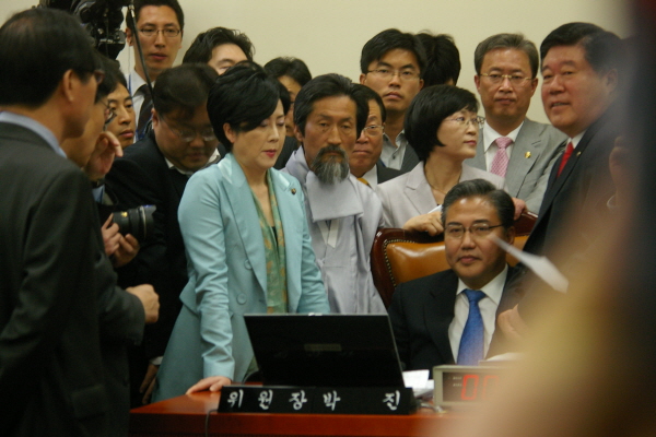 강기갑 민주노동당 의원도 “미국은 화살과 창을 던지며 재협상하자고 하는데 한국 국회는 방패를 다 버리자고 하고 있다”고 비판했다. 강기갑 의원은 “18대 국회에서는 변화된 상황에 대한 영향평가도 제대로 되지 않았다”며 중단을 요구했다.