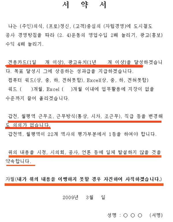유 씨는 글과 함께 계약서 원본을 첨부했다. 유 씨가 첨부한 계약서의 내용을 보면, ‘영업수입 2배 늘리기, 광고(홍보)수익 4배 늘리기 도시철도 공사 경영방침을 따라’ 전용카드 1일 몇 개 이상, 광고유치 1년 몇 개 이상 등 달성 목표를 적게끔 했다. 뿐만 아니라 “갑천, 월평역 근무조, 근무방식(통상, 시차, 조근무), 직급 등을 변경해도 의의가 없으며 갑천역, 월평역이 22개 역사의 평가부분에서 1등을 해야 한다"고 명시되어 있다.