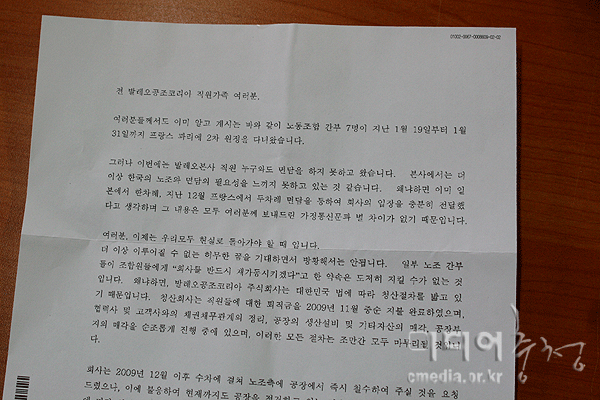 “전자우편을 각 가정으로 보내는 데 내용은 노조가 대화를 회피한다는 것이예요. 가족에게 통지문 보내 불법 점거 하고 있다는 둥… 노조가 대화를 요구해도 응하지 않으면서 가족들에게 걱정과 염려를 시킨다는 것 자체가 화가 난다. 우리가 바라는 것은 경영상의 위기라고 하면 차라리 인정하겠어요. 고통 분담도 할 수 있어요. 그러나 협상자리에서 일단 얼굴 맞대고 대화하자는 것이에요. 1차적으로 대화할 수 있는 자리가 마련되어야 하는 거 아닌가요? 공장 정상화를 위해 하나씩 문제를 풀어가자는 거죠.”