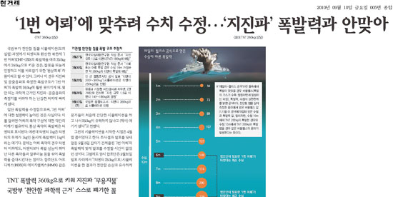 천안함을 침몰시킨 폭발력의 규모는 사고 당일인 3월26일 백령도에서 측정한 지진파와 공중음파가 폭발력을 과학적으로 가늠해 볼 수 있는 거의 유일한 근거였다. 한겨레는 “기상청이 추산한 TNT 140~180kg은 제쳐두고라도, 최대치로 폭발규모를 추정한 한국지질자원연구원(지질연)의 260kg과도 어긋난다. 지진파와 공중음파를 천안함의 침몰 시각과 위치를 특정하는 중요한 근거 가운데 하나로 삼아온 국방부로선 뼈아픈 대목”이라고 강조했다.