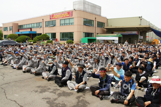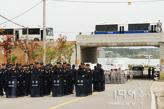 또한 11시부터 경찰병력 5개 중대(버스 11대)가 공장정문 100미터 떨어진 곳에서 대기 중이며, 관리자와 용역은 어제와 똑같이 경찰병력 뒤에서 피켓을 들고 선전전을 진행 중이다.