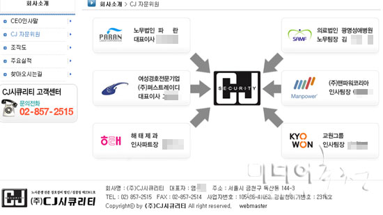 CJ시큐리티 홈페이지상 염00 대표이사가 운영하는 업체는 등기부등본상 2002년 6월 설립했다. 설립당시에는 이00 대표이사 체계였다. 의료법인 광명성애병원 노무팀장 김00 씨를 비롯해 노무법인 ‘파란’, (주)맨파워코리아, 해태제과 관계자 등이 자문위원으로 참여하고 있다.