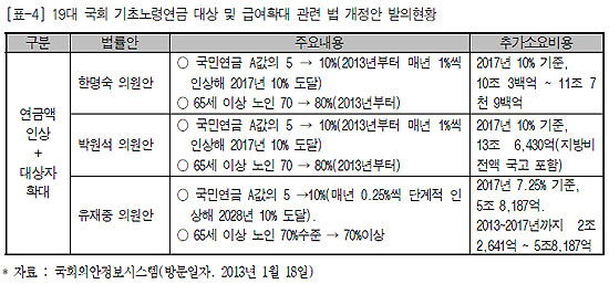 박 당선인의 기초노령연금 두 배로 확대 공약은 새로운 것이 아니라 이미 기초노령연금법 부칙에 명시된 사항이다. 지난 2007년 국민연금이 개악되어 기존 60%에서 2028년에는 40%까지 떨어지게 되자 국민연금의 급격한 급여인하와 사각지대 해소를 위해 기초노령연금이 신설, 이후 10%까지 단계적으로 인상한다는 내용이 담긴 것이다.