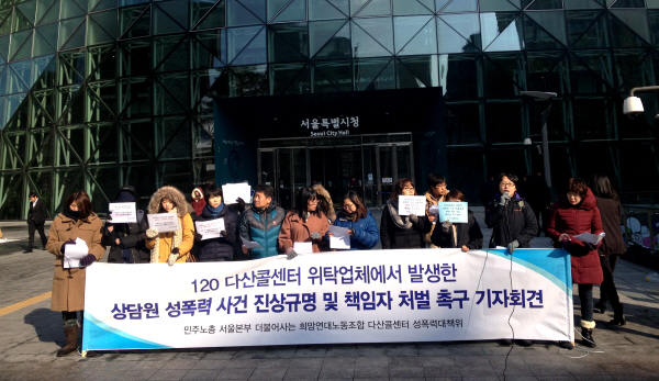 민주노총 서울본부 희망연대노동조합 다산콜센터지부는 6일 아침 서울시청 앞에서 기자회견을 열어 다산콜센터 위탁업체의 성폭력 가해 사실을 고발하고, 사건을 서울시 인권위원회에 제소했다. 다산콜센터지부는 “위탁업체에서 발생한 사건의 진상을 규명하고 관련자들을 처벌하라”고 촉구했다.