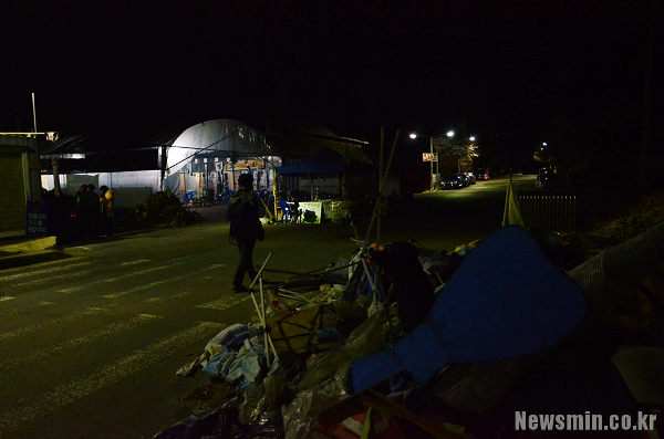 ▲ 사드기지 진입로인 경북 성주군 초전면 소성리 마을회관 앞. 주민들과 사드 반대 단체 회원들은 공사 장비 반입을 막기 위해 밤을 지새고 있다. [출처: 뉴스민] |