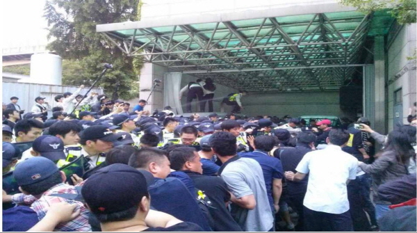 그리고 오후 6시 20분 경. 경찰은 장례식장에 300명에 달하는 기동대 병력을 투입했다. 경찰은 오후 6시 10분 경 부친의 112 신고를 받았다고 밝혔다. 신고 10분 만에 대규모 병력을 꾸려 출동했다는 설명이었다. 당시 현장에 있던 조합원들은 종일 장례식장 주변에 경찰버스 3대와 사복 경찰로 의심되는 사람들이 배치 돼 있었다고 증언했다. 특히 이날은 청계광장서 열린 ‘세월호 만민공동회’ 대규모 집회로 경찰 1만여 명이 서울에 집중된 때다. 때문에 경찰이 유족 신고 이전부터 시신 탈취를 기획한 것 아니냐는 의혹이 일었다.