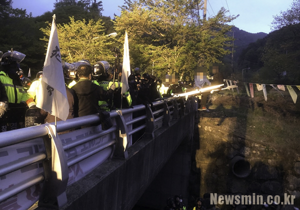 ▲ 사드기지와 1.2km 떨어진 경북 성주군 초전면 소성리 진밭교. 경찰이 장비 반입을 막기 위해 집회를 열려던 사드 반대 주민을 강제 해산하고 있다. [사진=사드원천무효 소성리 종합상황실] [출처: 뉴스민] |