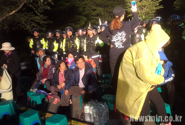 오후 8시 10분 현재 비가 내리는 가운데 주민들과 사드 반대 단체 회원들은 진밭교 위에서 연좌하며 사드기지 공사 장비 반입 저지를 위한 농성을 벌이고 있다.
