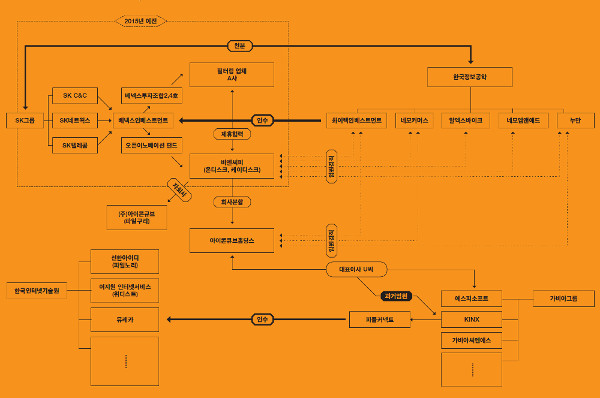 4년 전, SK텔레콤이 비엔씨피와 아이콘큐브홀딩스를 누구에게 매각했는지 알려진 바는 없다. 비엔씨피의 경영정보 공시는 2014년 4월에 멈춰 서 있다. 정부 기관의 경영 공시 기록도, 민간 기업평가 자료도 모두 누락돼 있다. 실 소유주의 정체도 알 길이 없다. 알 수 있는 정보라고는 비엔씨피와 자회사 아이콘큐브가 운영하는 온디스크, 케이디스크, 파일구리의 대표이사가 김 모 씨로 동일하다는 것 정도다. 하지만 좀 더 자세히 살펴보면 어떤 지점에서 숨겨진 ‘연결고리’가 나타난다. SK그룹과 막역한 사이로 알려진 ㈜한국정보공학과 그 주변에 포진한 ‘인물’들이다.