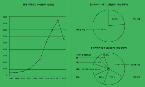 여성가족부가 2016년 실시한 ‘전국 성폭력 실태조사 결과보고서’에 따르면, 몰카 피해 경험에서 가해자 유형은 모르는 사람이 76.2%, 아는 사람이 23.8%였다. 발생장소는 지하철, 버스 등 일상적으로 이용하는 대중교통시설이 33.7%로 가장 많았고. 상업지역 22%, 학교 12.8%, 직장 7.8%, 집 6.1% 순으로 나타났다.
